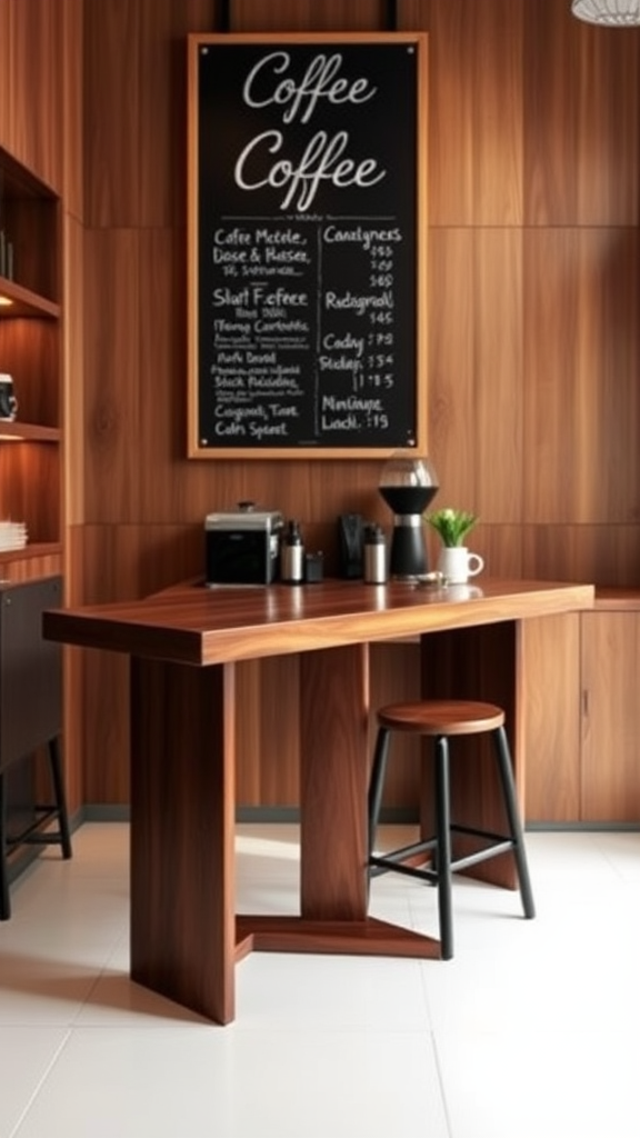 In a cozy coffee shop, a sleek bar table crafted from rich mahogany stands against wooden walls, its warmth complemented by the soft glow of ambient lighting. The minimalist interior is enhanced by the pristine white floor, creating a clean, modern atmosphere. Above, a large blackboard bears the day's specials in an elegant script, inviting patrons to savor the experience.