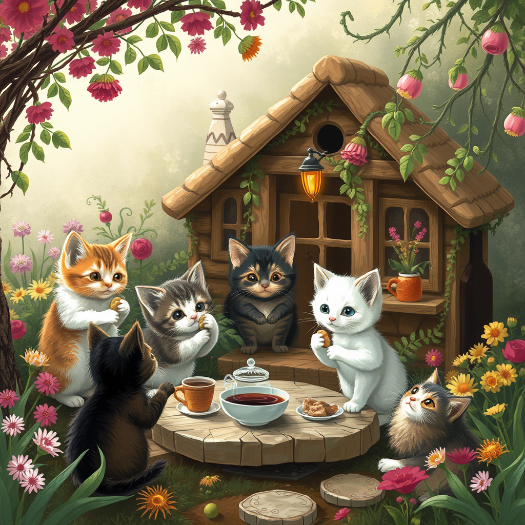 In a cozy cottage nestled amid a whimsical garden, a group of playful kittens busied themselves with charming tasks. They darted about, skillfully preparing tea, brewing aromatic coffee, and crafting rich, velvety chocolate. Their tiny paws effortlessly fetched delightful meals from the rustic kitchen, while others scampered down to the cool, shadowy cellar to retrieve fine bottles of wine. Each kitten, with its own distinct personality, contributed to the harmonious medley of bustling activity, creating an enchanting symphony of culinary delights and warm, comforting aromas that filled the air.