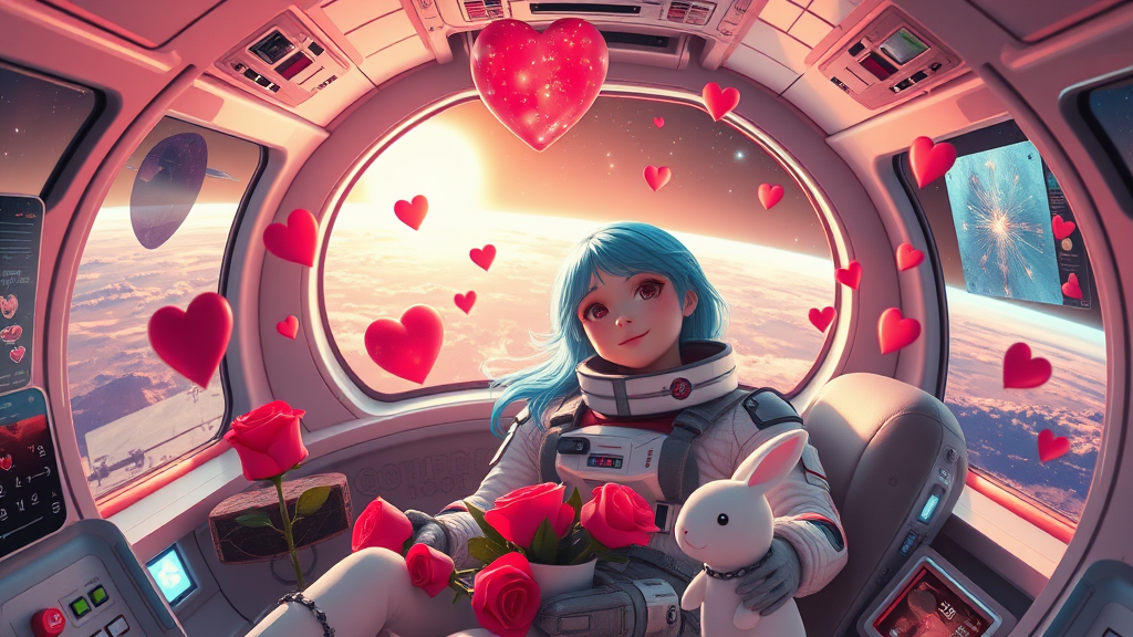 In a cozy spacecraft with sleek design and transparent walls offering an unobstructed view of far-off planets and alien landscapes, heart-shaped decorations and roses float gracefully in zero gravity. A radiant, adorable blue-haired girl with cybernetic implants, free from a space uniform, enjoys the warmth of the environment. Playful holographic displays project stars and galaxies alongside cute rabbits engaging in whimsical antics. The advanced technology creates a romantic and futuristic atmosphere, with cinematic lighting enhancing the hyper-realistic scene, captured in stunning 8k resolution with the vibrant tones of Fuji color film.