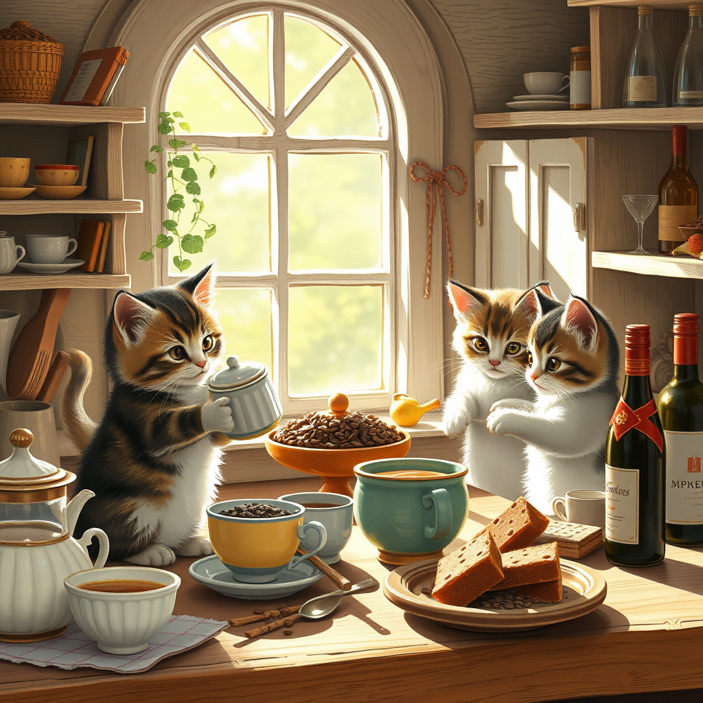 In a cozy, sunlit cottage, playful kittens busily prepare an array of delightful beverages and treats. They skillfully steep fragrant tea leaves, brew aromatic coffee, and melt creamy chocolate with delicate precision. These tiny chefs scurry across the kitchen, fetching delicious meals with infectious enthusiasm. In the charming cellar, they carefully select the finest wines, adding a touch of sophistication to the enchanting scene.