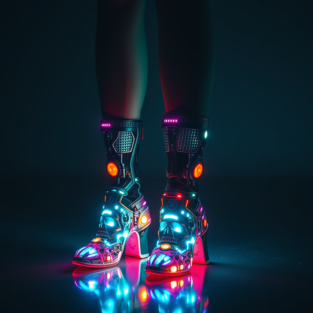 In a Cyborg Utopia, a female figure stands with gleaming Biomech Fractal Skull Ankle Boots, demonstrating intricate detail in 32K UHD. The Fractal pattern shimmers in low-light conditions, rendering in a majestic, movie-quality image with a crystal clear cascade of glowing LED lights emanating from the boots, spreading downwards like a radiant aura. Vibrant colors dance across the biomechanical design, capturing the essence of a visual masterpiece, professional-grade photography in RAW format that highlights the minute details of the cyberpunk gear, showcasing a realistic, futuristic, highly detailed biomechanical masterpiece.
