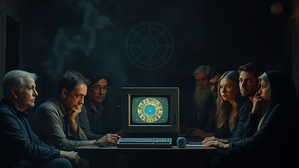 In a dark and cool aesthetic, a group of diverse individuals gather around an ancient computer that embodies the essence of artificial intelligence. The scene, reminiscent of a 1982 supernatural mystery thriller, is captured in ultra-clear resolution, with a strong balance of surreal and ethereal elements. The setting feels both esoteric and dreamy, evoking the mysterious ambiance of a Tarot card. The composition is intriguing, filled with unique, expressive elements and strange circumstances. The low-key lighting enhances the cinema-like atmosphere, creating a powerful visual narrative. Each person in the group holds a story of their own, intricately woven into the enigmatic tapestry of this gathering.