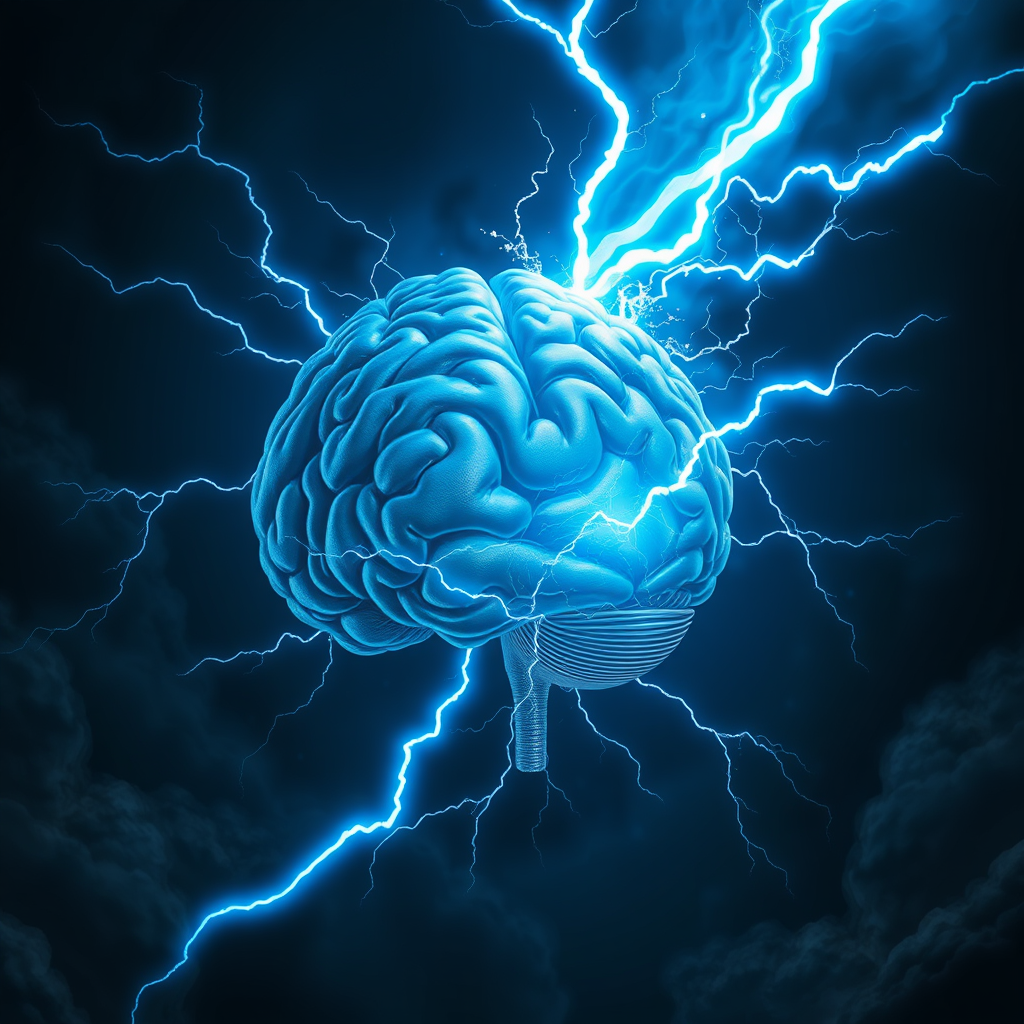 In a dark and mysterious environment, a brain is struck by a bright neon blue bolt of lightning, transforming it into a glowing orb of energy. The orb exhibits a metallic sheen, surrounded by swirling streams of vibrant energy. The background teems with faint, enigmatic shadows, enhancing the mystical and otherworldly mood. This digital illustration captures a fantastical scene filled with intricate details and textures, blending the ethereal with the extraordinary in a captivating visual display.