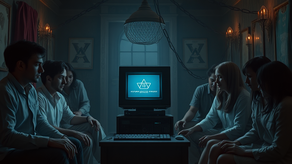 In a dark, cool aesthetic reminiscent of a 1982 supernatural mystery thriller, a scene unfolds with ultra-clear resolution. A diverse group of humans gathers around a central computer, a symbol of AI, set against an interesting and dreamy background. The composition exudes a surreal, ethereal vibe, infused with expressive power and a tarot card-style esoteric atmosphere. The setting is marked by strange circumstances and unique elements, creating an intriguing living situation. The low-key lighting enhances the mysterious aura, with dark tones enveloping the scene. The narrative hints at individual stories within the group, drawing from a blend of human curiosity and technological intrigue. The imagery captures an ultra-clear, stylized reality with a raw, powerful depiction that balances the surreal and the real, creating a compelling visual mystery.