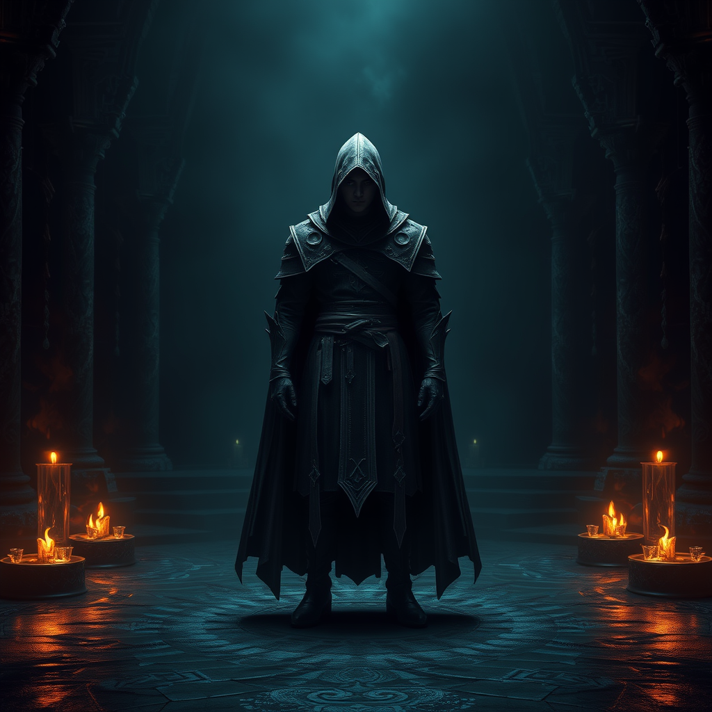 In a dark fantasy ambiance, a figure stands in a proud pose, cloaked in shades of deep gray. They are centered in the scene, exuding an air of medieval mystery and power. The atmosphere is rich with detail and ultra-high quality, with symmetrical elements that enhance the sense of balance and otherworldly elegance in the digital artwork. Subtle creative shifts in the lighting and textures bring added depth to the composition, accentuating the character's commanding presence in this mystical realm.