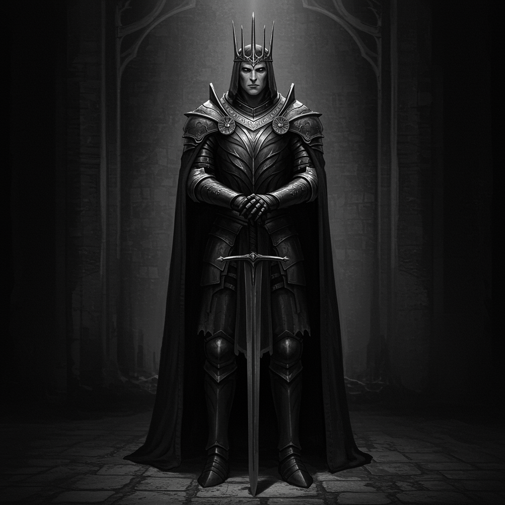 In a dark fantasy realm, a figure stands in a proud and regal pose, bathed in shades of gray. The scene captures a medieval atmosphere, with intricate details highlighting the figure's ornate armor and flowing cloak. Symmetrically centered within the composition, the digital artwork exudes an ultra-quality finish, drawing the viewer into its mysterious and enchanting ambiance.