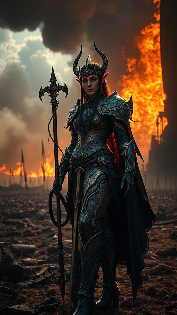 In a dark fantasy setting, an epic wide shot captures a stunningly beautiful and powerful elf warrior woman standing amidst a forgotten battlefield, her intricate armor and elaborately detailed weapon gleaming in the faint sunlight. The scene is rich in photorealistic detail, showcasing the maximalist CGI style synonymous with the intense Diablo aesthetic. Massive scale and dramatic elements are emphasized through an aerial perspective as the sun's crepuscular rays pierce the smoky air, creating a halo effect around her. The fierce determination in her eyes portrays the slow-motion intensity of a goddess in rage, ready to face the towering wall of fire behind her. Her presence is both commanding and ethereal, surrounded by an atmosphere of occlusion and depth focus that highlights the complicated, realistic textures of the scorched earth and sky.