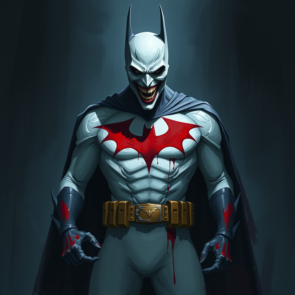 In a dark, unsettling scene, a nightmarish version of Batman emerges. This twisted figure is clad in a suit of ghostly white or light gray, contrasting sharply against the shadowy background. A jagged, blood-red bat symbol dominates the chest, accompanied by streaks of crimson adorning the gauntlets, belt, and edges of the cape. Most disconcerting is the face—a pale, skeletal visage shaped into an unnervingly wide grin reminiscent of the Joker. This corrupted hero is depicted in a digital painting style that uses loose, expressive brushstrokes, creating a textured and dynamic image. Stark and dramatic, the color palette emphasizes the stark white and vivid red against the dim, atmospheric lighting, enhancing the aura of menace and instability that surrounds the figure.