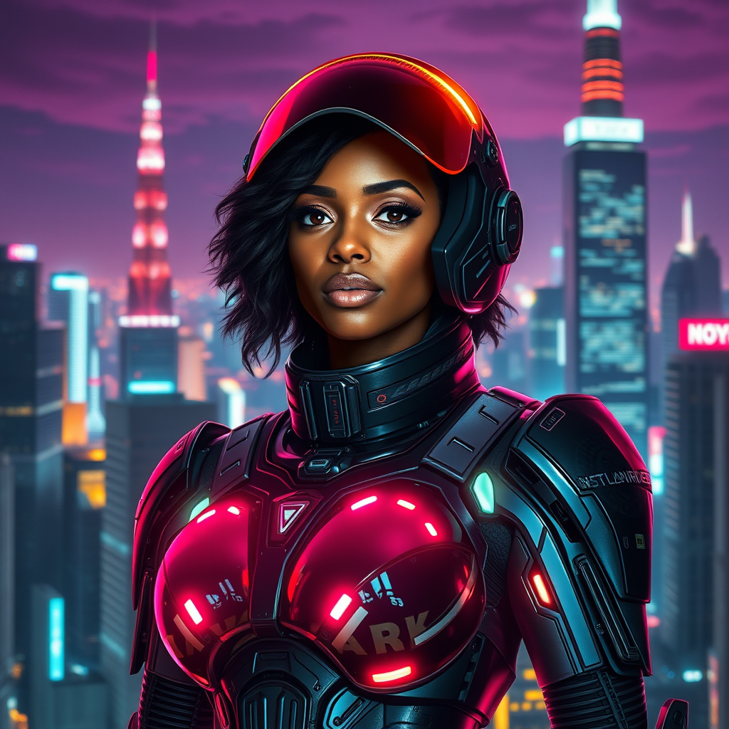 In a dazzling futuristic Neo-Tokyo cityscape under the night sky, the skyline is dominated by towering skyscrapers and vibrant neon lights. In the foreground, a stunning and powerful woman in her 20s, with a rich, brown complexion, stands tall. She is adorned in an exquisite cyberpunk afrofuturism armor that covers her entire form. The sleek, high-tech suit is equipped with a host of intricate gadgets and emits a spectrum of glowing colors that highlight its detailed design. The woman exudes confidence, her presence commanded by a high-tech helmet with a tinted visor, subtly concealing her eyes but not the intensity of her gaze. The ambient neon lights of the city enhance the futuristic setting, creating a visually mesmerizing image. Directed by Ridley Scott, this scene is an imaginative blend of the futuristic worlds influenced by Starship Troopers and Dredd, merging cyberpunk and afrofuturism to create a distinct and striking visual masterpiece.