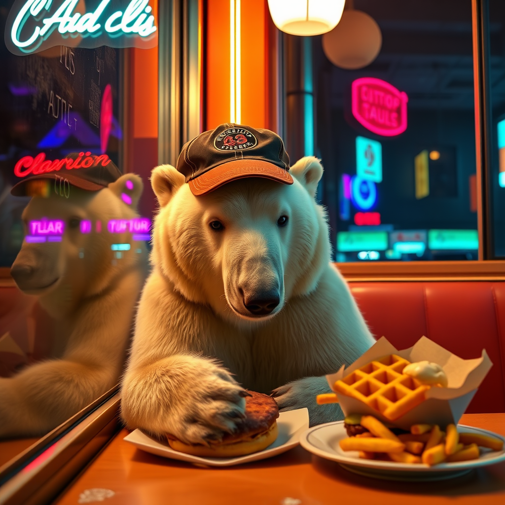 In a deserted New York cafe diner, a solitary and melancholic polar bear sits by the window, donning a vintage baseball cap. The soft glow of neon lights casts colorful reflections, enhancing the surreal atmosphere. It slowly savors a juicy cheeseburger and crispy waffle fries, captured through the vibrant and cinematic lens of renowned photographer Miles Aldridge.