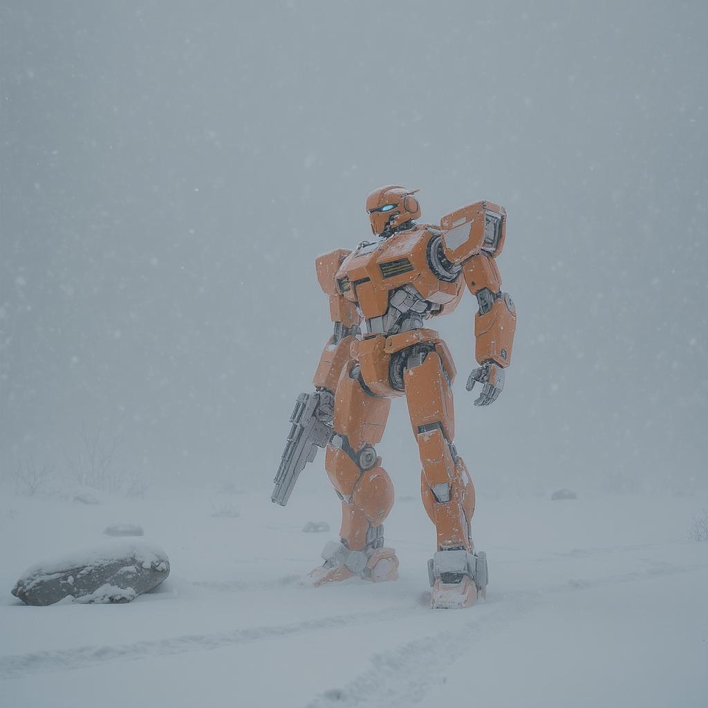 In a desolate post-apocalyptic landscape, a vivid orange robot stands resolute amidst the relentless snowfall, shrouded in a dense, clinging fog. Close-up shots capture its intricate details, each mechanical joint and etched panel telling a story of resilience. The low angles emphasize the robot's dominance over the barren terrain, its brightly colored frame a stark contrast against the endless white. It moves purposefully, leaving unique patterns in the snow, a solitary beacon of hope and tenacity in a world forgotten by time.