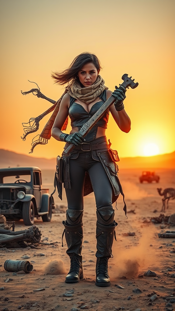In a desolate wasteland, a fierce Mad Max-like woman stands confidently amidst the ruins, her leather armor and tattered scarf billowing in the arid wind. Her piercing eyes scan the barren landscape, reflecting determination and resilience. Against the backdrop of an endless desert, rusted vehicles and skeletal remains of forgotten civilizations, she grips a makeshift weapon forged for survival. Dust swirls around her boots as the sun sets, casting an orange glow that silhouettes her hardened silhouette, embodying strength and hope in a post-apocalyptic world.