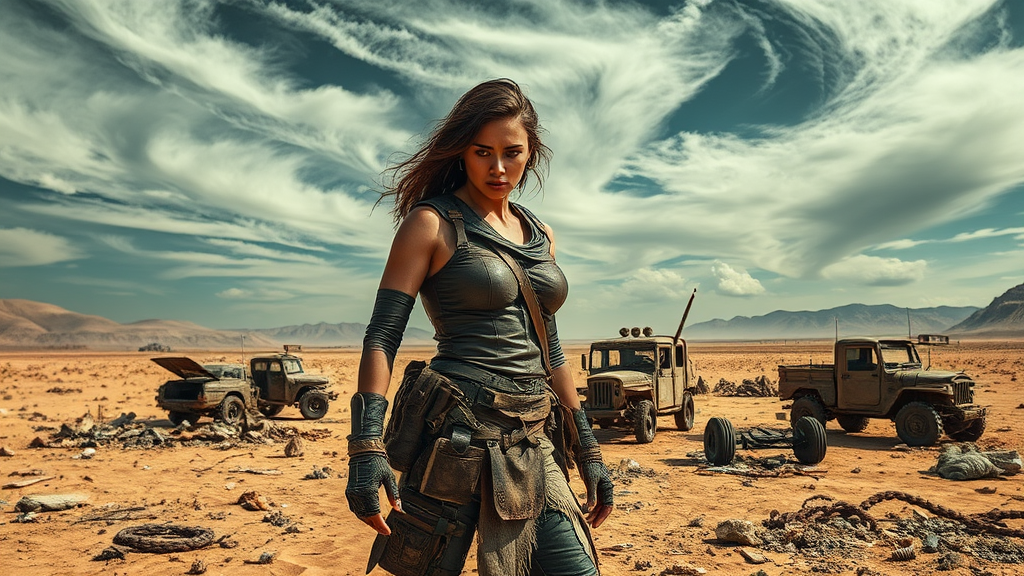 In a desolate wasteland, a fierce warrior woman stands defiantly amidst the ruins, her leather attire and makeshift armor dusted with sand and grime, embodying resilience and strength; her piercing eyes scanning the horizon for threats. The barren landscape stretches infinitely, littered with remnants of a lost civilization, while scavenging vehicles, cobbled together from scraps, lie dormant in the background. In this hauntingly beautiful scene, the sky swirls with ominous clouds, casting a dramatic light that contrasts sharply with the gritty foreground, hinting at both danger and hope in this untamed world.