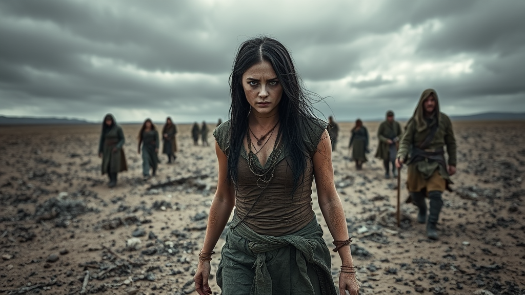 In a desolate wasteland where the sky is eternally shrouded in gloomy gray, a woman with raven-black hair and piercing green eyes trudges through the barren expanse, her face smeared with dirt and her body clad in tattered rags. She is a recent escapee from a grim dungeon, her eyes sunken with the weight of her harrowing experiences. Around her, others wander aimlessly, their appearances equally ragged and worn, reminiscent of the Hillmen of old. As they move through this Tolkien-esque landscape, their shared silence echoes the somber whispers of their past, their feet stirring the ashen earth beneath them.