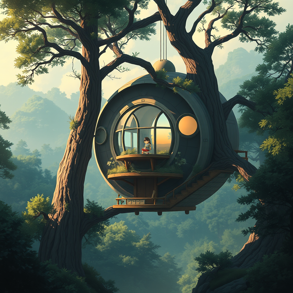 In a digital 2D art style reminiscent of Miyazaki's work, imagine an exquisitely detailed scene set in a futuristic, sci-fi world where magic infuses the dreamy landscape. A small, adorable girl navigates the vast wilderness, living independently among the towering trees. Her home is a marvel of simplicity and innovation—a round, multilayered architectural wonder suspended in the branches, blending seamlessly with nature. The intricate design of her quaint cabin speaks to a deep connection with the environment. Soft, dramatic lighting bathes the scene, creating a cinematic atmosphere that adheres to the rule of thirds, inviting viewers to explore the mesmerizing details and the girl's enchanting existence in this otherworldly realm.