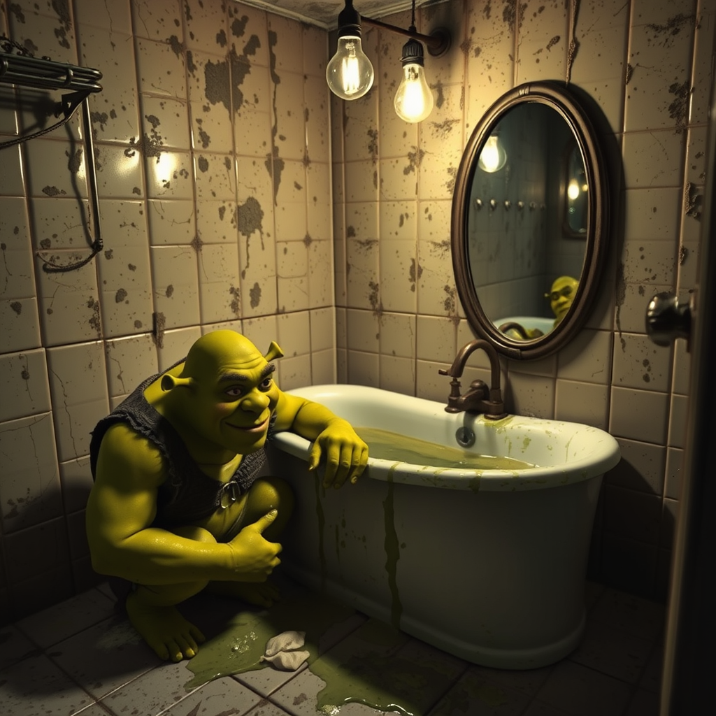 In a dilapidated, grimy bathroom of an abandoned house, Shrek crouches next to someone peering out from a bathtub filled with stagnant water. Both are equally coated in slime, and Shrek's eyes are bloodshot. The tiles are cracked, and the mirror is fogged, speckled with mold everywhere. The scene is dimly lit by a flickering bulb, casting distorted reflections of the two figures in the mirror, enhancing the eerie and haunting atmosphere.