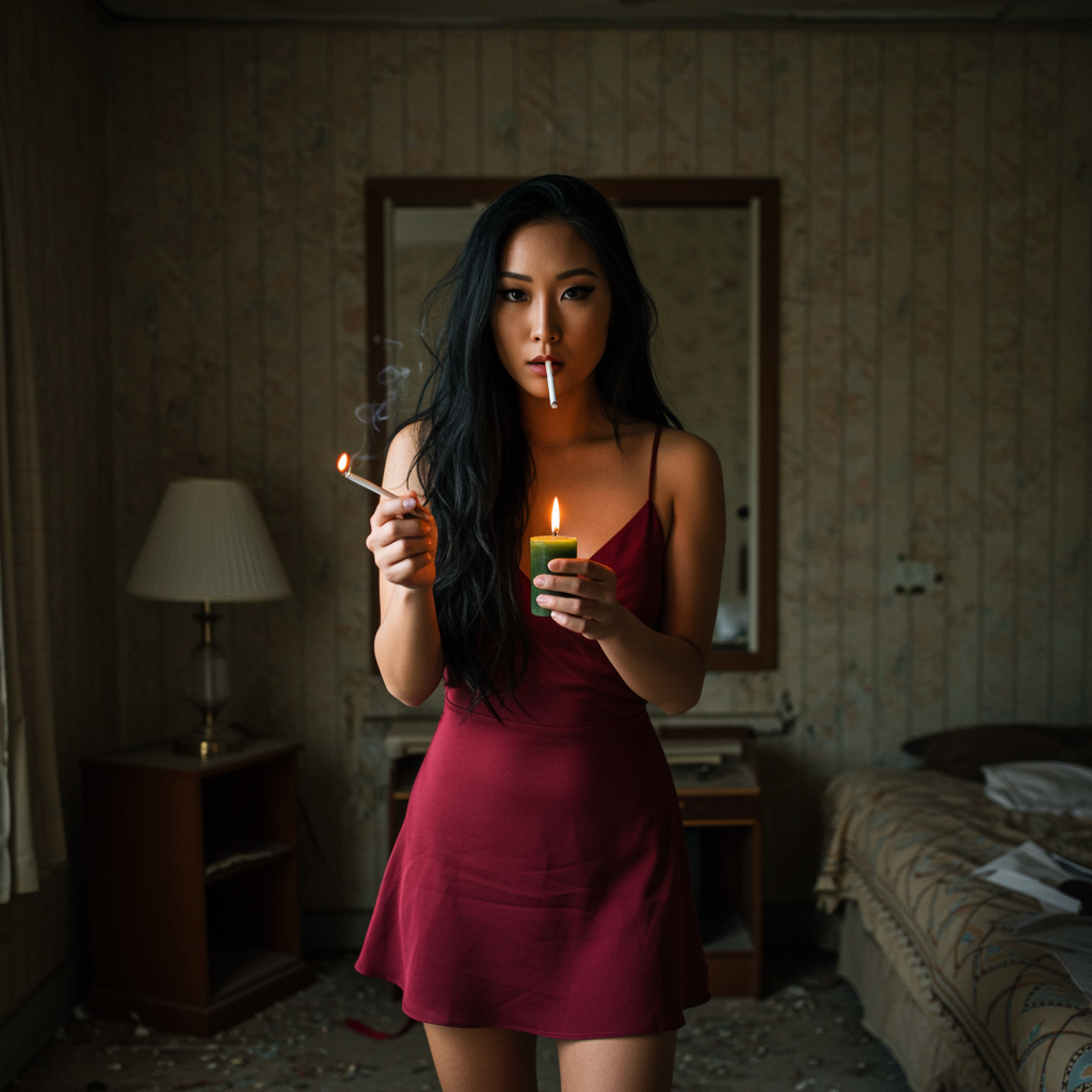 In a dilapidated motel room with faded wallpaper peeling at the corners, a striking Asian model with cascading raven hair stands poised. She dons a deep crimson mini dress with delicate spaghetti straps, the fabric catching the dim light in the room. In an almost cinematic gesture, she lights a cigarette with a flickering candle held tenderly in her hand. Her gaze meets the camera unwaveringly, her expression serene and intent, exuding an air of quiet confidence amidst her rundown surroundings.