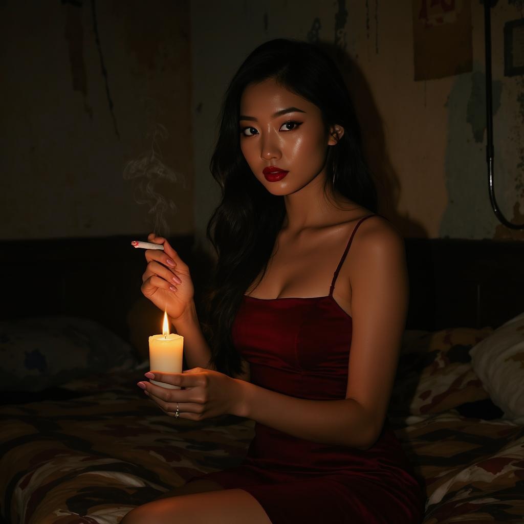 In a dim, dilapidated motel room, a captivating Asian model with flowing ebony hair, adorned in a deep crimson spaghetti strap mini dress, ignites a cigarette using the flickering flame of a candle she's holding. Her eyes meet the camera with a serene and intense gaze, capturing a moment of quiet defiance and elegance amidst the worn surroundings.