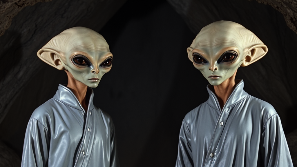 In a dimly lit cavern, reminiscent of vintage sci-fi television, two alien humanoid twins with unusually large heads stand side by side. They are clad in sleek, light gray robes that shimmer subtly in the low light. Their features are sharp and symmetrical, giving them an otherworldly elegance. The cave exudes an eerie atmosphere, with shadows dancing across the rocky walls. The scene captures the mysterious aura of a classic retro sci-fi series.