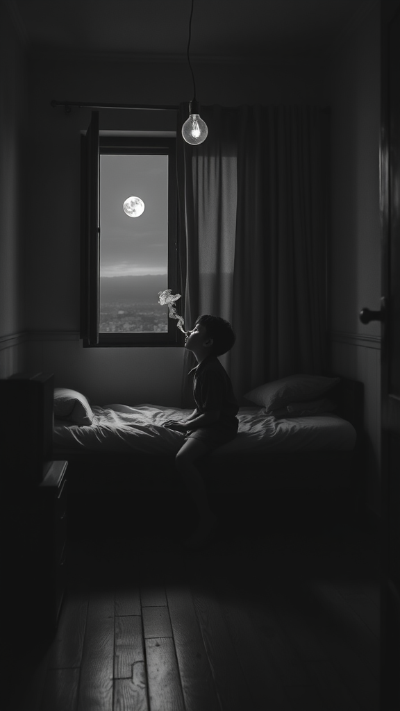 In a dimly lit, cinematic black-and-white room, an Asian-looking boy quietly sits on the edge of a modest bed, a faint curl of smoke rising from the cigarette between his fingers. The room is sparse, with walls adorned with faint shadows cast by a solitary bulb hanging from the ceiling. An open window offers a glimpse of the outside world, though heavy curtains obscure most of the light, letting only thin beams of moonlight spill onto the worn wooden floor. A gentle breeze rustles the curtains, and the sound of distant city life drifts into the stillness of the room, creating a serene yet introspective atmosphere.