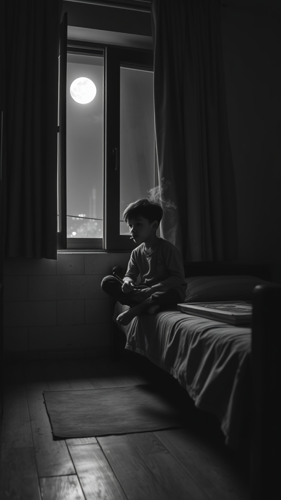 In a dimly lit, cinematic black and white scene, a young boy of Asian descent sits pensively on the edge of a narrow bed, a wisp of smoke curling from the cigarette held between his fingers. The room is modest, its sparse furnishings hinting at a transient existence. An open window, framed by heavy curtains, allows slivers of moonlight to filter through, casting delicate shadows on the worn wooden floor. The soft breeze stirs the curtains gently, carrying with it the distant hum of the city night.