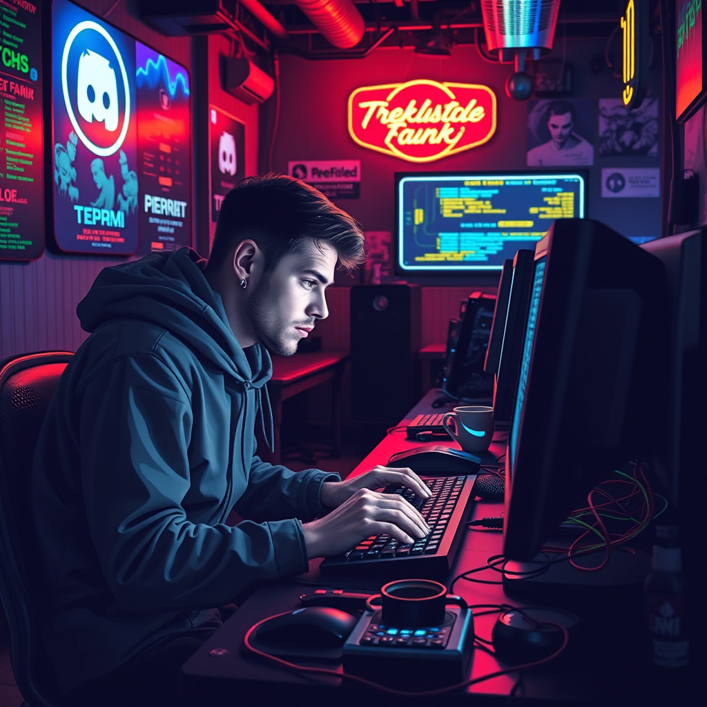 In a dimly lit, futuristic cybercafe, Kaleb sits hunched over his computer, fingers flying across the keyboard as he furiously codes away on his next-generation Discord bot. His eyes are narrowed in focus, the glow of the screen illuminating his focused expression. The air is thick with the scent of freshly brewed coffee and the distant hum of mainframes, as if the very fabric of the internet is humming in sympathetic resonance with Kaleb's creative fervor. The cybercafe's walls are adorned with vibrant, neon-lit advertisements for cutting-edge tech firms and cyberpunk-inspired art pieces, which seem to pulsate with an otherworldly energy. Kaleb's own workstation is a riot of colorful cables and peripherals, with shattered remains of discarded coding marathons scattered about like digital casualties. His hyper-focused persona is a perfect blend of exhausted programmer and inspired artist, synonymous with the dreamlike realm of the cyberpunk universe. As he codes, Kaleb's inner monologue is a kaleidoscope of code snippets, testing protocols, and ambitious goals, as if the sheer weight of his creation is trying to burst forth from his very fingertips. The cursor blinks in relentless synchrony with the beat of his racing heart, fuelled by an existential drive to push the boundaries of digital innovation.