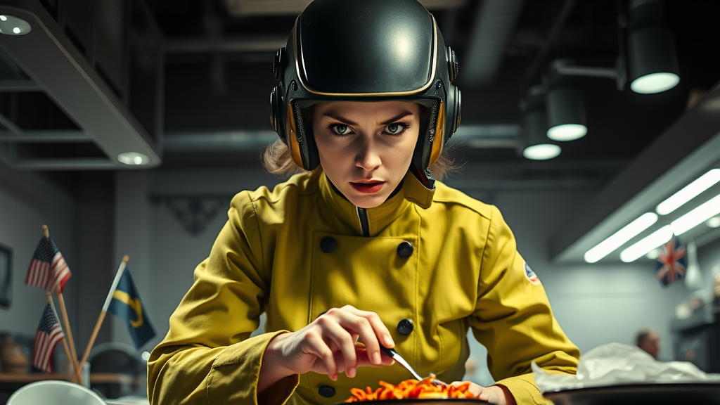 In a dimly lit futuristic restaurant kitchen, an aggressive female cook dressed in an elaborately detailed Chartreuse Earthy green uniform engages in dynamic action. The uniform's dieselpunk style is emphasized by realistic fabric details and intricate folds, giving it a sophisticated yet industrial look. Her face is captured in extreme detail, showing wide-open eyes and a raised eyebrow, her expression one of intense focus and mild frustration while preparing mundane food. The setting is depicted with a simple, monochrome background that keeps contrast low, allowing her vivid presence to take center stage. The kitchen features hints of sci-fi with hard-surfaced elements and a helmet adorning her head. In a nod to various allegiances, small flags including stars and stripes and a subtle union jack are incorporated into the ambience. Despite the low background noise, her dynamic and dramatic posture signifies a captivating scene filled with motion and emotion.