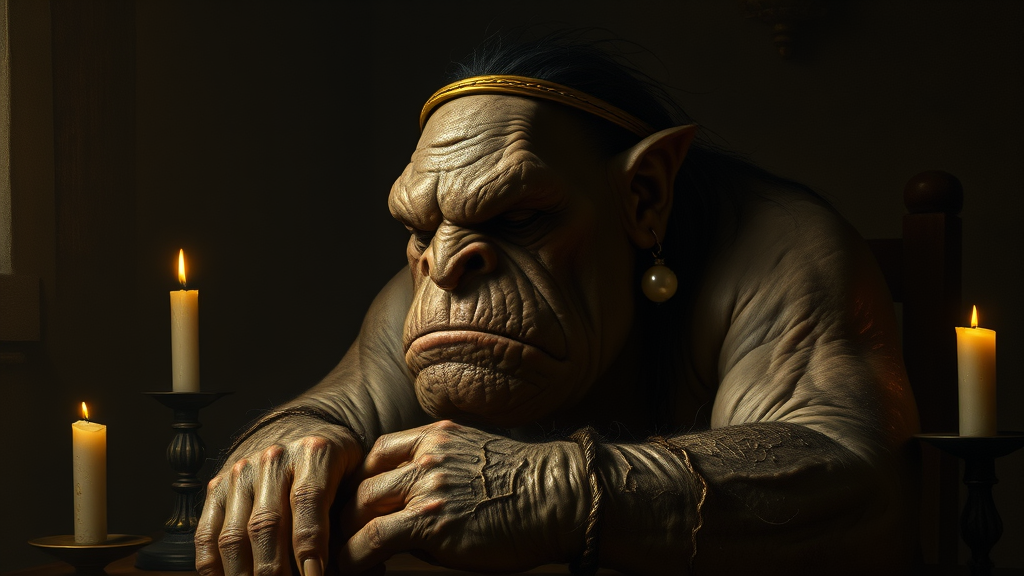 In a dimly lit, misty room, an ogre sits peacefully, its rugged features softened by the soft glow of candlelight. The creature's gruesome visage, typically associated with terror, is now tranquil, much like the serene maidens found in Vermeer's works. It wears a golden circlet around its scalp, adorned with a single, glistening pearl earring that seems all too out of place in its usual surroundings. As with the maidens in the Dutch master's paintings, the ogre's hands are a prominent feature, with large, gnarled fingers appearing almost delicate as they support the weight of its massive head. However, in this reimagining, a layer of grease or oil on the ogre's skin catches the faint light, giving its rough complexion an eerie sheen. Light and shadow are central to this piece, much like in the original, with the highlight on the pearl earring the focal point against the overshadowed, unrefined ogre's face. A faint mist in the air enhances the atmosphere of quiet contemplation, steering the viewer’s eye towards the ogre’s serene, large eyes. Color palette is muted, save for the pearl itself, retaining the palette typical of Vermeer, which emphasizes earthy tones, soft blues, and creams. This reimagined piece, however, subtly introduces darker hues, emphasizing the ogre’s wild and primitive nature, layered over the refined and serene setting of the painting. Ultimately, the juxtaposition of an ogre with an air of elegance and sophistication is both unhurried and unexpected, immersing the viewer in an extraordinary and intriguing scene.