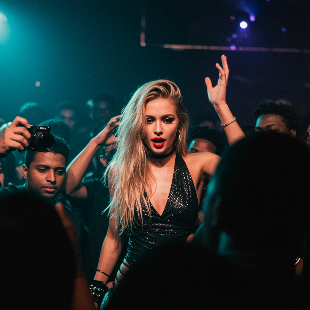 In a dimly lit nightclub pulsating with bass, a pop sensation navigates a whirlwind of flashing cameras and whispered scandals, her world spinning into chaos while she seeks refuge in the shadows, her voice echoing stories of liberation and self-discovery.