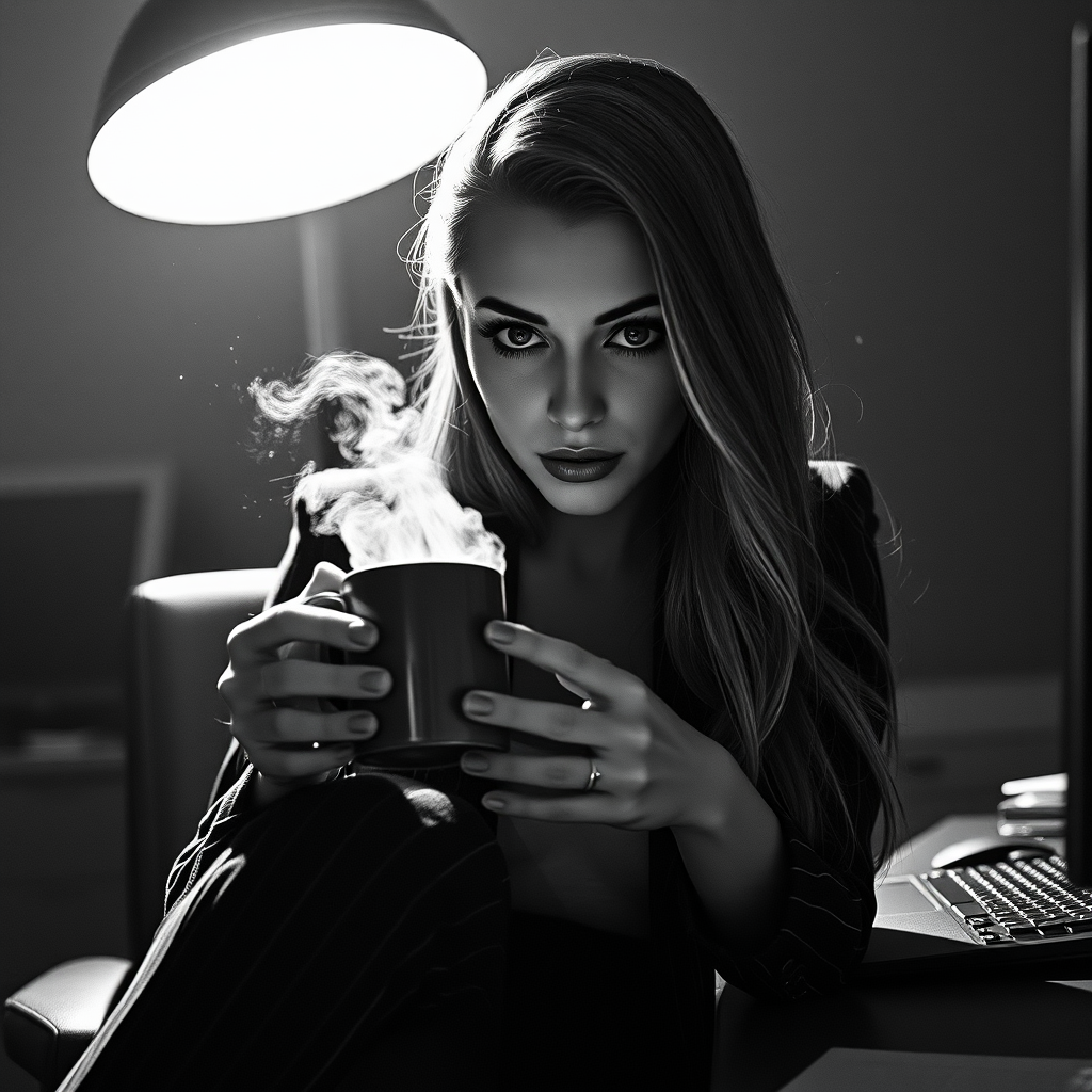 In a dimly lit office, the most beautiful detective in the world is captured in striking black and white film stock. She sits at a desk, cradling a steaming cup of coffee, her long, shiny hair cascading over her shoulders. Her detailed, symmetrical face is a canvas of contrast, with dark, reflective eyes focused intently, framed by subtle makeup and a sprinkle of freckles. The light catches the pinstripes on her trousers, accentuating her slender figure, as she leans forward, deep in thought. Dust particles dance in the air, visible in the dramatic rim lighting cast by a ceiling lamp above. The scene is artfully composed, reminiscent of a classic Noir from the 1940s, with a sparse desk setting that includes a keyboard and a mouse. The atmosphere is immersive, enriched by the shallow depth of field that draws attention to her expressive features, capturing the essence of a private investigator enveloped in a world of intrigue.