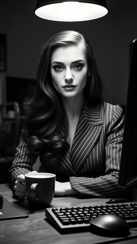 In a dimly lit room, a captivating detective from the 1940s sits confidently at her desk, surrounded by an aura of mystery. Her long, shiny hair cascades elegantly, complementing her striking, symmetrical face adorned with subtle freckles. Her dark, reflective eyes exude determination, framed by expertly applied makeup. Clad in stylish pinstripe trousers, she embodies the allure of the era. A cup of steaming hot coffee rests nearby, casting a cozy ambiance in the black and white setting. The high-contrast film captures dust particles dancing in the air, highlighted by a dramatic rim of light from the overhead ceiling lamp. The shallow depth of field focuses intently on her, leaving the background softly blurred. Details of her office emerge—a vintage keyboard and mouse add to the scene’s authenticity, creating a nostalgic feeling of the past. She exudes intelligence and grace as her deft fingers navigate the clues before her, bringing noir charm to life in the monochromatic tones. In this captivating portrait, the beauty of a bygone era is preserved with elegant simplicity and atmospheric lighting, and her presence is both commanding and captivating, inviting viewers deep into her world.