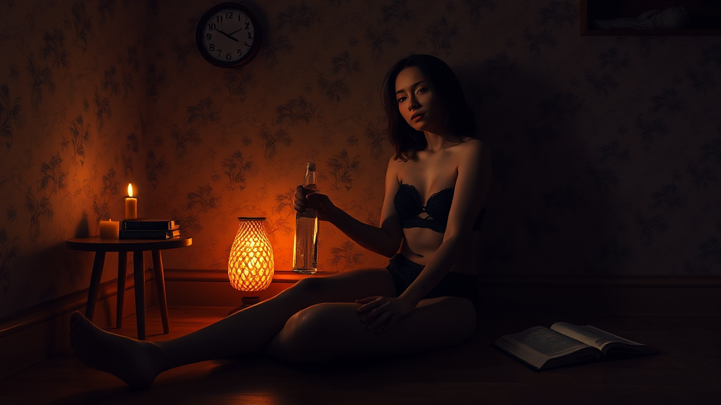 In a dimly lit room, a cinematic scene unfolds featuring a woman seated on the wooden floor, exuding a calm and relaxed demeanor. She is adorned in dark, floral-patterned lingerie, with a slightly slouched posture as she leans against the wall, an empty glass bottle cradled in one hand. Beside her, a small amber lamp casts a soft, warm glow, creating dramatic shadows that accentuate her silhouette. The wallpaper in the background has a gentle, floral texture, adding subtle depth to the minimalist room. Above her, a colorful wall clock quietly marks the passing of time, while small touches—a burnt-out candle and an open book nearby—enhance the ambiance of introspection and solitude. The color palette is subdued, featuring muted tones that allow the amber light and shadows to bring contrast and depth to the scene. A contemplative fine art photograph capturing a moment of quiet reflection and urban solitude.