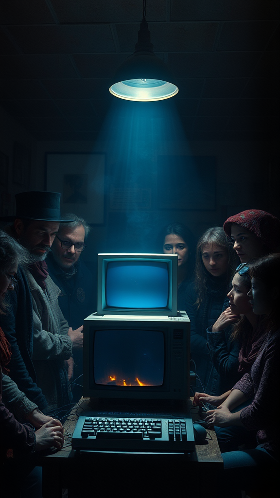 In a dimly lit room, a diverse group of people is gathered around an old computer that radiates an aura of mysticism, symbolizing the presence of AI. The atmosphere is charged with an ethereal and surreal energy, highlighted by an expressive balance between light and shadow, giving a cinematic feel reminiscent of a 1982 supernatural thriller. Each person appears captivated, as if part of a live tarot reading, their expressions full of wonder and curiosity. The setting is an esoteric and dreamy environment, filled with peculiar, unique elements that suggest strange circumstances. Dark, cool tones dominate the scene, enhancing the mysterious and mystical vibe. The composition is intriguing and artistic, with ultra-clear resolution capturing every detail in this low-key light setting that invites viewers to delve into the unknown stories that unfold.