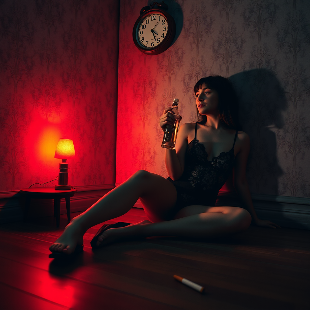 In a dimly lit room, a woman sits on a wooden floor, her presence calm and tranquil. She wears dark, intricately designed floral-patterned lingerie, her posture relaxed as she leans gently against the wall. In one hand, she holds an empty glass bottle, its surface reflecting the subtle glow from a small red lamp. The lamp casts warm, soft light across the room, creating dramatic shadows that highlight her silhouette. The wallpaper behind her features a gentle floral design, adding a layer of texture to the minimalist surroundings. Above her, a colorful wall clock softly implies the passage of time, while nearby, a burnt-out cigarette and a lighter provide hints of solitude and introspection. The room is adorned in muted tones, its subdued palette allowing the interplay of red light and shadow to infuse depth and contrast into the scene. This cinematic image is a fine art photograph capturing a moment of urban isolation and serene contemplation.