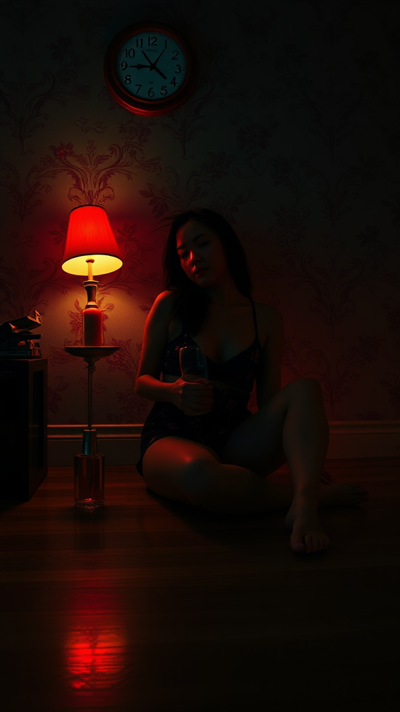 In a dimly lit room, a woman sits serenely on a wooden floor, exuding an air of calm and relaxation. Her dark, floral-patterned lingerie softly contrasts with her slightly slouched posture as she leans against the wall, an empty glass bottle resting in her hand. Beside her, a petite red lamp emits a warm, gentle glow, casting dramatic shadows and accentuating her silhouette. The subtle floral pattern of the wallpaper behind her adds texture to the otherwise minimalist space. Above her, a vividly colorful wall clock marks the passage of time, while small details—a burnt-out candle and an ornate lighter nearby—enhance the atmosphere of melancholy and solitude. The subdued color palette, dominated by muted tones, gives way to the contrasting red light and shadows, infusing depth into the scene. This contemplative photographic moment captures quiet introspection and urban solitude, reflecting a unique blend of moodiness and cinematic realism.