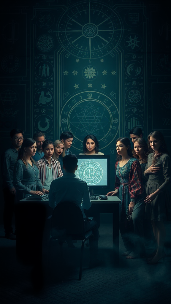 In a dimly lit room that radiates an ethereal and mysterious vibe, a diverse group of people huddles around a glowing computer monitor. The computer, symbolic of an AI presence, becomes the focal point amidst an esoteric setting that feels both surreal and dreamlike. Each individual is captured in a tarot card style rendering, their expressions and postures hinting at hidden stories and strange circumstances. The background is filled with intricate patterns and symbols that evoke a sense of mystery, contributing to the low key and cool aesthetic. The composition is carefully balanced, with a dark palette and no clouds or stars visible, emphasizing the unique and otherworldly ambiance. The scene is rendered in ultra clear resolution, capturing every detail with expressive power and an enigmatic allure.
