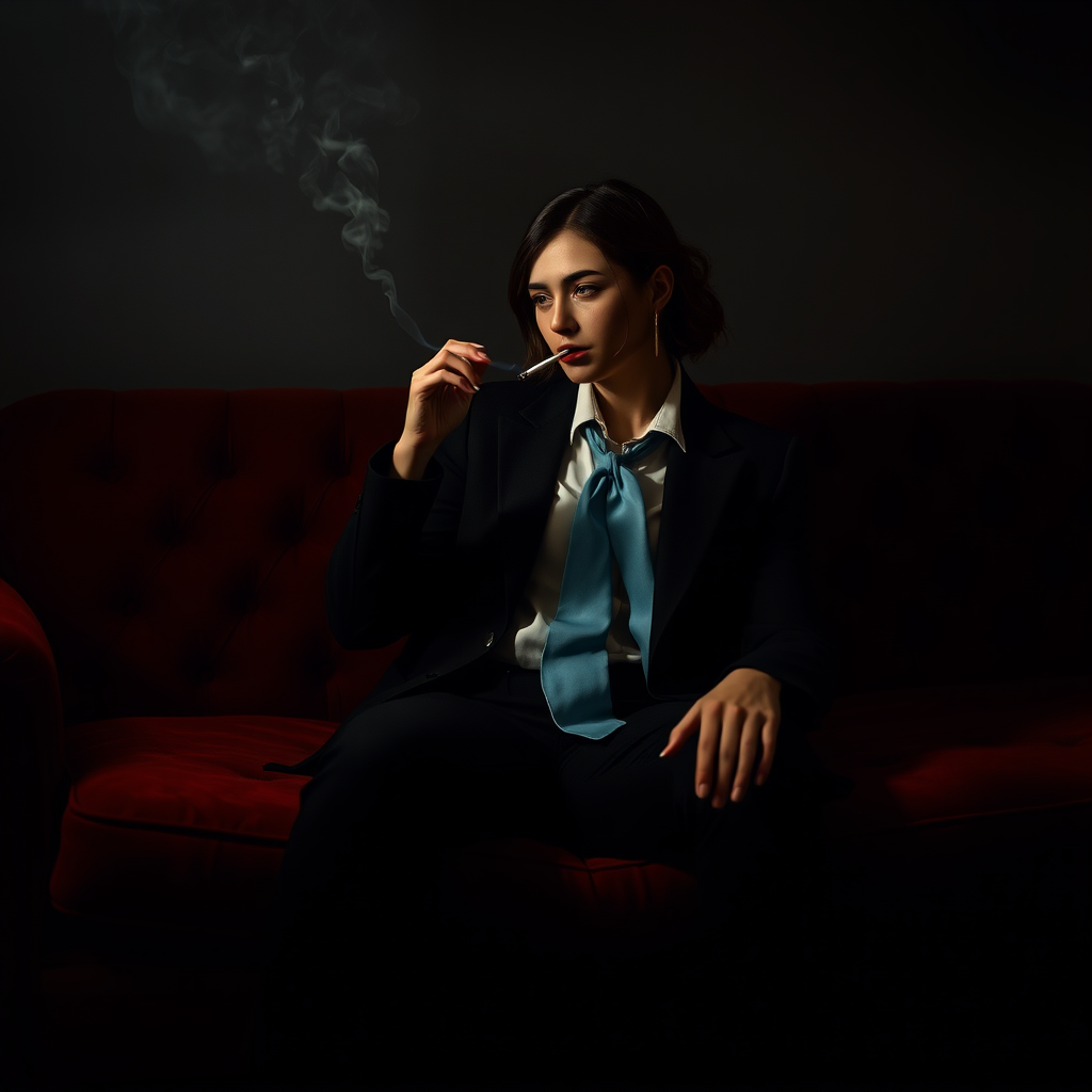 In a dimly lit room with a hazy atmosphere, a female figure is elegantly draped across a deep crimson vintage couch. She is clad in a sharp black suit paired with a crisp white shirt, the ensemble accented by a loose, sky-blue tie. Her arm rests casually on her bent knee, while her other hand holds a glowing cigarette that sends tendrils of smoke swirling gently upwards. A solitary beam of light from an unseen source off-camera casts its focus on her, filtering through the thick smoke to create dynamic patterns and shadows. This moody, dark scene has a cinematic quality resolution, with high contrast highlighting an air of contemplation in her relaxed posture. The ambient glow from the light not only illuminates her but also contributes to the intimate and introspective atmosphere of the portrait.