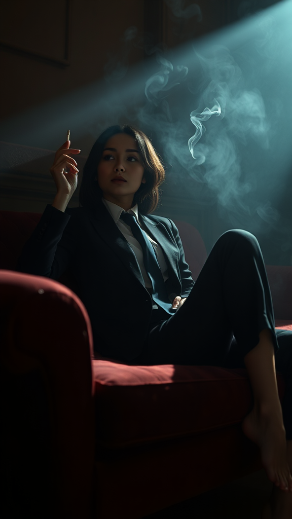 In a dimly lit room with a hazy atmosphere, a photograph captures a female figure reclining on a deep crimson, rustic couch. Sheβs wearing a black suit paired with a white shirt and a loosely knotted navy blue tie. Her arm is gracefully resting on her bent knee, while her hand holds a glowing cigarette, creating a delicate trail of smoke that weaves through the air. The scene is illuminated by a beam of light from an unseen source off-camera, the light filtering through the smoke and casting intricate patterns that enhance the moody and dark atmosphere. This cinematic-quality portrait has high contrast, and her posture conveys an air of contemplation, with the ambient glow further contributing to the intimate and introspective mood of the scene.