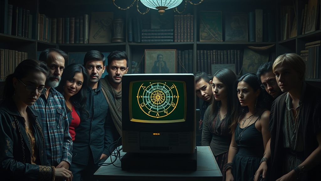 In a dimly lit room with an eerie, otherworldly atmosphere, a diverse group of people huddles around an old-school computer that exudes an aura of mystery and intelligence. The scene feels like a blend of the past and the future, captured in an ultra-clear resolution that highlights every detail. The setting has a surreal and ethereal quality, with an eclectic mix of symbols and artifacts hinting at arcane knowledge. The computer, representing AI, is the focal point, its screen glowing with enigmatic algorithms and patterns reminiscent of a tarot card's intricate design. The individuals, each with distinct and expressive features, seem both intrigued and apprehensive, their expressions telling a story of wonder and caution. The composition of the scene is striking and balanced, with shadows and light playing off each other in a way that enhances the mysterious vibe. The low key lighting creates a cool, dark aesthetic, emphasizing the esoteric and enigmatic nature of the gathering. The background is filled with intriguing elements—perhaps a shelf of dusty books, strange trinkets, and esoteric symbols—that add layers to the narrative. There's a sense of strange circumstances bringing these people together, and their stories intertwine in this unique moment of discovery and mysticism. The raw style of the image captures the essence of a 1982 mystery thriller while infusing it with a modern twist, creating an engaging and deeply atmospheric scene.