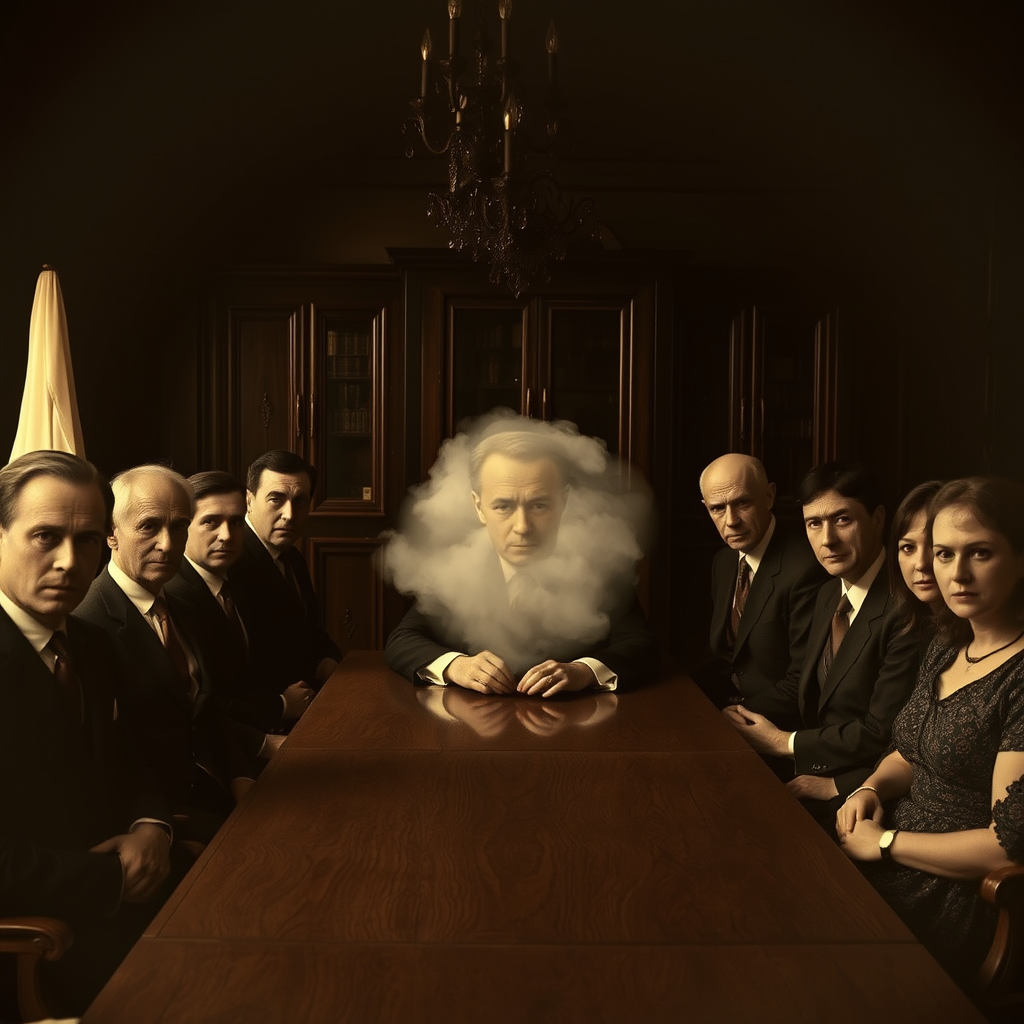In a dimly lit, sepia-toned photograph, a group of elegantly dressed men and women sit around a grand, elongated oak table, their faces cast in shadows. At first, the gathering appears ordinary, yet an unsettling detail disrupts the scene: the figure positioned prominently at the center of the table has his face obscured by a cloudy, swirling distortion, as if the photograph itself is trying to erase him. The eyes of those surrounding him dart sideways, filled with unease, their expressions frozen in a moment of anxious anticipation. The room's opulent decor fades into the background, leaving a lingering sense of mystery and suspense.