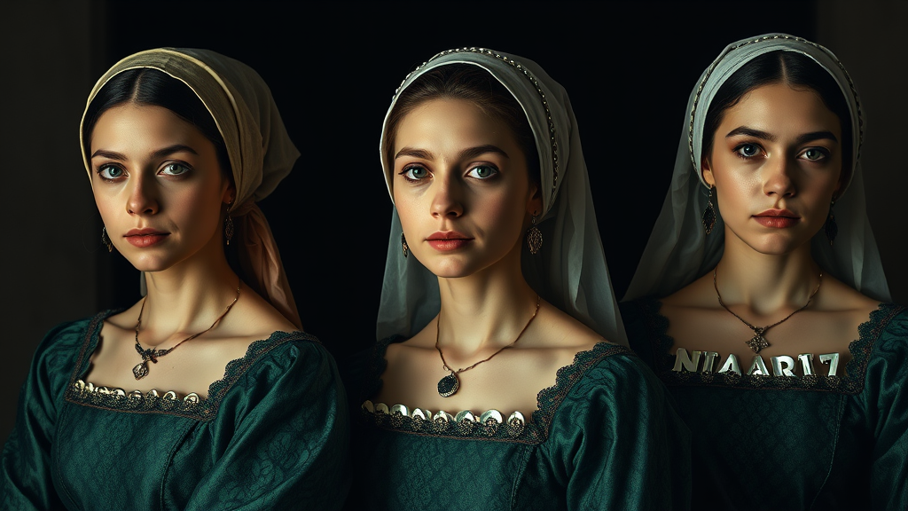 In a dimly lit setting, three women donning Renaissance-inspired attire are captured with the precision of contemporary realist portrait photography. Their expressions are serene, with each garment showcasing intricate Ottoman art patterns woven in deep emerald hues, reflecting a touch of green academia. The realism in each fine detail is striking, from the delicate textures of their fabrics to the subtle play of light and shadow. The scene unfolds in a composition that is both graceful and timeless, encapsulating the essence of an era reimagined with a modern lens.