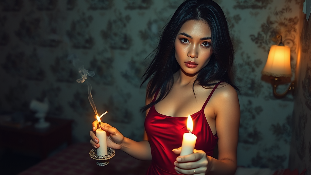 In a dimly lit, shabby motel room with peeling wallpaper, an enchanting Asian model with flowing black hair dons a deep crimson spaghetti strap mini dress. She uses a flickering candle to light a cigarette, her eyes mesmerizing and intense as she gazes directly into the camera, exuding an air of serene concentration amidst the grungy surroundings.