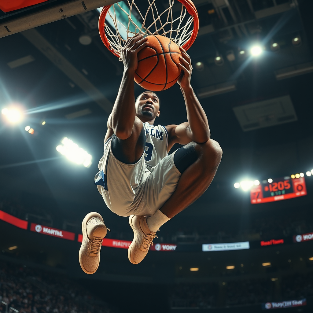 In a dimly lit stadium, a hyper-realistic basketball highlight captures an explosive slam dunk by a professional athlete. The player, mid-air and suspended above the rim, has sweat glistening on their face, showcasing raw determination. The shot focuses on the player's powerful hands gripping the basketball, capturing the intensity of the moment. Stadium lights cast dramatic shadows on the court, emphasizing the athlete's dynamic motion. The camera setup includes a Sony A9 III with a Sony FE 70-200mm f/2.8 GM lens, shutter speed at 1/1000 sec, aperture at f/2.8, ISO 8000, utilizing continuous AF with tracking and high-speed continuous burst mode. The lighting features stadium floodlights at an angle as the main source, a softbox on the side for shadow details, a spotlight highlighting the athlete's silhouette, and subtle rim lighting to separate the player from the background. The composition frames the athlete slightly off-center in a 16:9 aspect ratio, capturing the court's width and the player's motion with a blurred background for focus. The mood conveys an electrifying atmosphere, emphasizing energy, passion, and athleticism, making the viewer feel immersed in the action. In post-production, details, sharpness, and contrast are enhanced for a hyper-realistic effect, with color adjustments making the athlete's jersey and basketball pop while maintaining the moody stadium ambiance.
