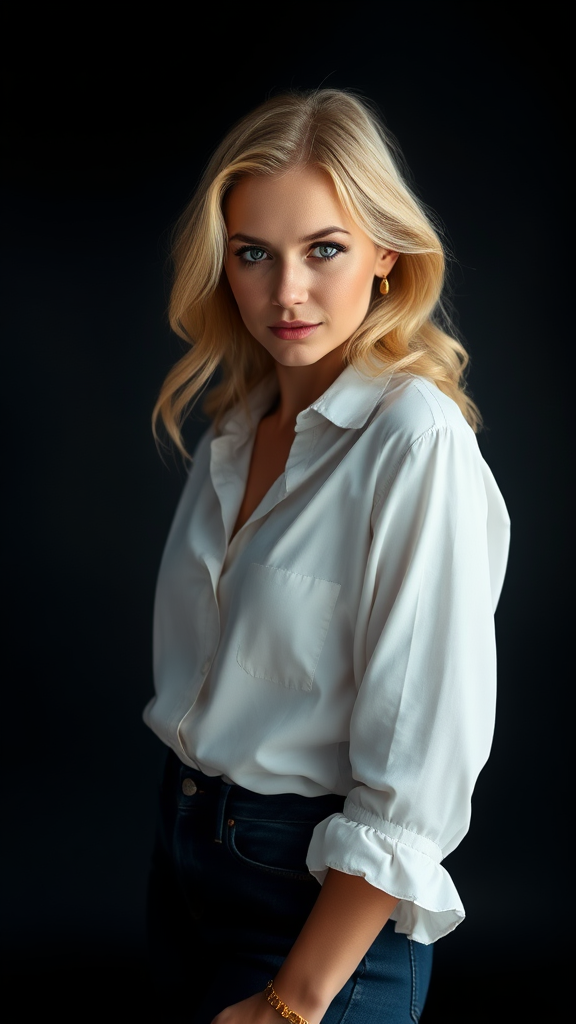 In a dimly lit studio with a deep charcoal backdrop, a striking blonde woman poses with captivating green eyes that catch the light. She wears a crisp, white blouse with sleeves rolled up to the elbows and a pair of fitted, dark indigo jeans. Her hair falls in soft waves around her shoulders, adding a touch of softness to the modern, minimalist setting. The contrast between her bright attire and the dark background highlights her confident yet serene presence. Subtle golden jewelry accents her ensemble, adding a hint of sophistication to the casual elegance of the scene.