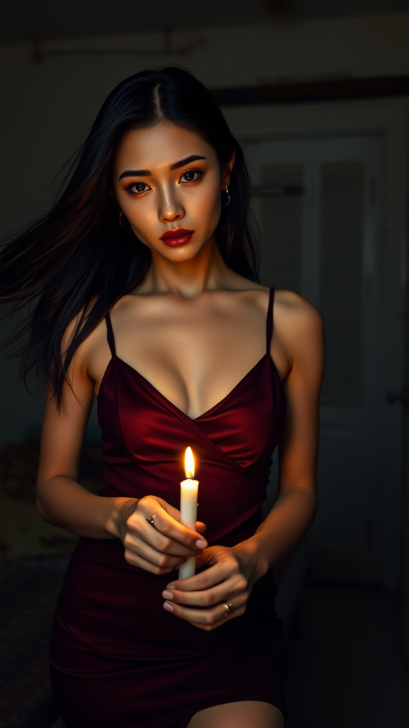 In a dimly lit, weathered motel room, a captivating Asian model with flowing, jet-black hair dons a dark crimson spaghetti strap mini dress. As she ignites a cigarette using a flickering candle, her gaze remains serene and unwavering, fixed intently on the camera, her expression embodying an intriguing blend of tranquility and determination.