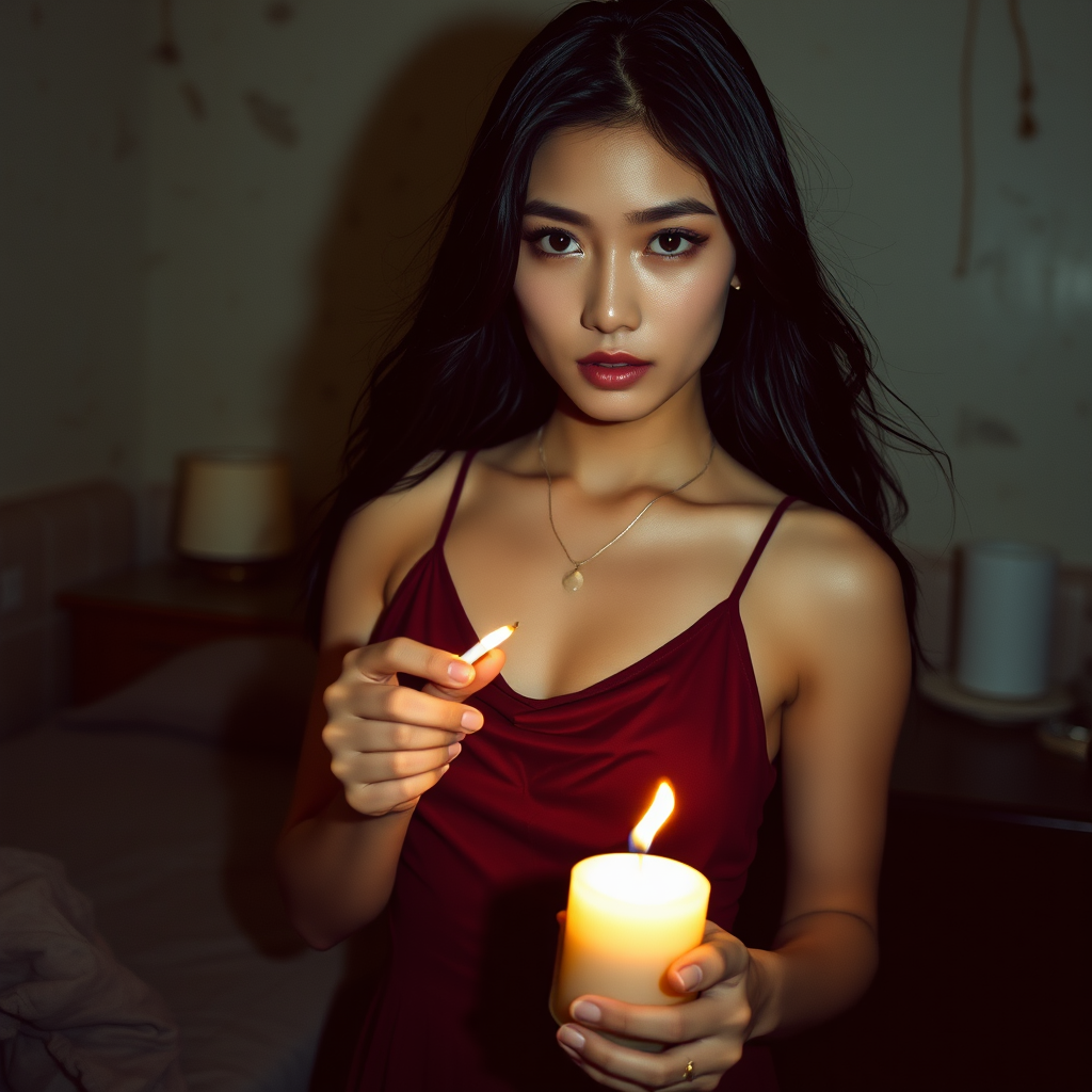 In a dimly lit, weathered motel room, a captivating Asian model with flowing ebony hair, dressed in a dark crimson spaghetti strap mini dress, delicately lights a cigarette using the flickering flame of a candle she holds. Her expression is serene and intent, her gaze fixed squarely on the camera, exuding an air of mystery and introspection amidst the room's peeling wallpaper and the faint scent of rain.