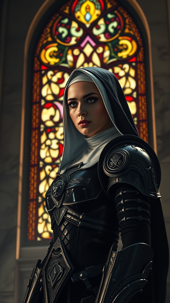 In a dramatic scene, a devoted sister of battle stands poised, her figure framed by an intricate stained glass window. She is adorned in sci-fi nun armor that reflects the gritty essence of the Warhammer 40k universe. Her symmetrical face is enhanced by dark eyebrows and expertly applied mascara and makeup, while her eyes shine with reflective intensity. The setting features marble walls, with dust particles catching the light, creating a halo around her figure. Detailed lighting effects, including rim and dramatic chiaroscuro lighting, underscore the grandeur of the moment. The composition is a professional masterpiece, reminiscent of majestic impressionism blended with modern influences from Waterhouse, John Constable, and Studio Ghibli, among others. The atmosphere is filled with depth and intricacy, evoking the dramatic style of Jeremy Mann and Greg Manchess, and the high detail artistry of trending works on ArtStation and CGSociety. The overall impression is both compelling and dynamic, remaining faithful to the source inspiration while adding unique artistic flourishes.