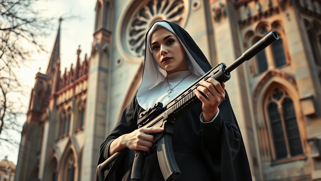 In a dreamlike, ethereal fantasy scene, a stunning nun stands gracefully, cradling a formidable machine gun against the grandeur of a Gothic cathedral backdrop. The outdoor setting is bathed in soft, enchanting light, reminiscent of the Die Brücke art movement. Surrealist touches infuse the scene with an otherworldly quality, where reality blurs into a captivating, imaginative vision.