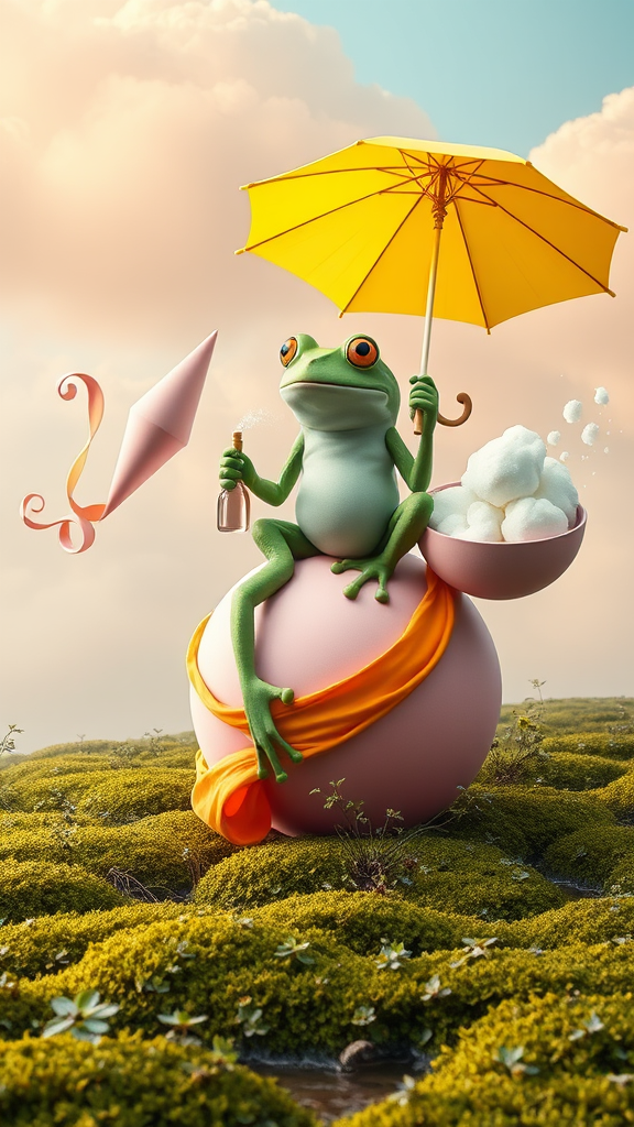 In a dreamlike landscape, a large, emerald-green anthropomorphic frog with a serene expression is perched on a pastel pink sphere draped in a tangerine-hued fabric. The frog gracefully holds a bright yellow parasol in one hand, while a tiny misting bottle rests in the other. Surrounding the frog are whimsically floating, abstract shapes: swirling pink and lemon-yellow cones, and a bowl brimming with fluffy, cloud-like substance. The sky stretches behind them in a soothing blend of soft peach and azure clouds, creating a mystical backdrop. Below, the ground is a swampy tapestry of lush moss, adorned with drifting aquatic vegetation and petite, flourishing plants. The scene exudes a whimsical, fantastical charm, with gentle lighting enhancing its playful, surreal essence.