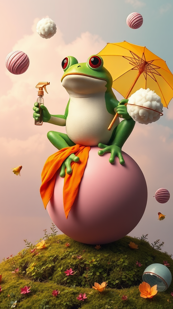 In a dreamlike setting, a large, green, anthropomorphic frog with a serene expression perches calmly atop a pink sphere draped with a rich orange fabric. In one hand, the frog holds a vibrant yellow umbrella, and in the other, a delicate spray bottle. Floating around are surreal, abstract shapes, including pink and yellow spiral cones and a whimsical bowl brimming with fluffy, cloud-like substances. The backdrop features a pastel sky tinged with gentle hues of pink and blue clouds, casting a magical glow over the scene. Beneath the frog, the ground is a lush, mossy expanse, scattered with floating vegetation and small, vibrant plants. The entire composition is imbued with a whimsical, fantastical essence, with soft, ethereal lighting enhancing the playful atmosphere.